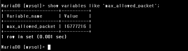 확인 show variables like 'max_allowed_packet';