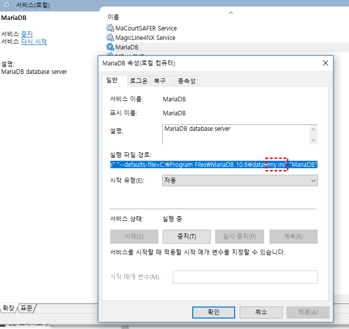 윈도우 에 설지된 MariaDB 의 설정 파일 경로를 찾아 수정해준다.