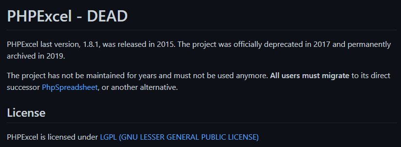 PHPExcel 마지막 버전인 1.8.1은 2015년에 출시되었습니다. 이 프로젝트는 2017년에 공식적으로 사용이 중단되었으며 2019년에 영구적으로 보관되었습니다.