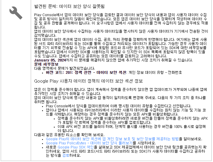 구글에서 Google Play 정책을 준수하지 않는다고 앱 조치 하라는 메일이 왔다.